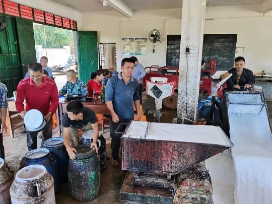 在龙江分公司雄英2队收胶站,胶工、胶农们纷纷前来公司收胶站卖胶水。袁国华摄